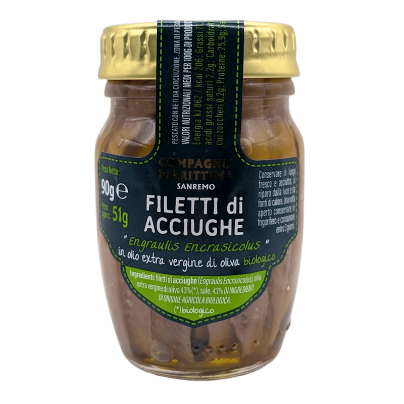 ANCHOIS (SARDELE) FILETY W BIO OLIWIE Z OLIWEK EXTRA VIRGIN 90 g (51 g) (SŁOIK) - COMPAGNIA MEDITERRANEA
