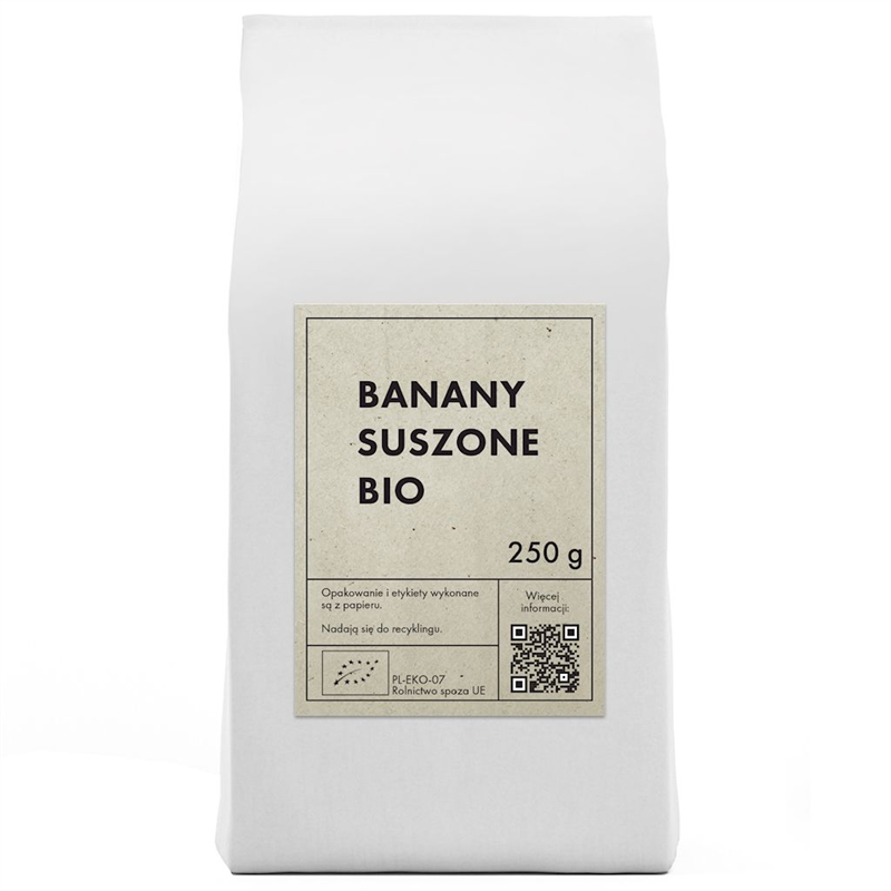 Ekologiczne banany suszone to pyszna i ciekawa w smaku pożywna przekąska. Kawałki bananów charakteryzują się miękką, lekko gumowatą konsystencją. Znakomicie smakują prosto z torebki, jak również jako dodatek do dań orientalnych, musli, sałatek owocowych, ciast i deserów.