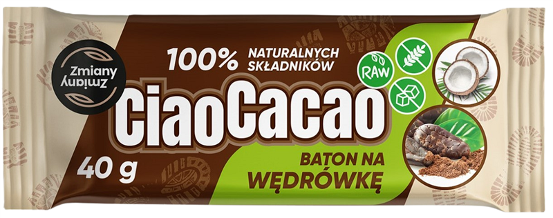 Ciao Cacao to baton w 100% naturalny, bez dodatku cukru, bezglutenowy i wegański, a przy tym intensywnie kakaowy i przyjemnie kokosowy. To idealny wybór dla każdego, kto potrzebuje porządnej dawki energii i smaku - bez zbędnych dodatków.