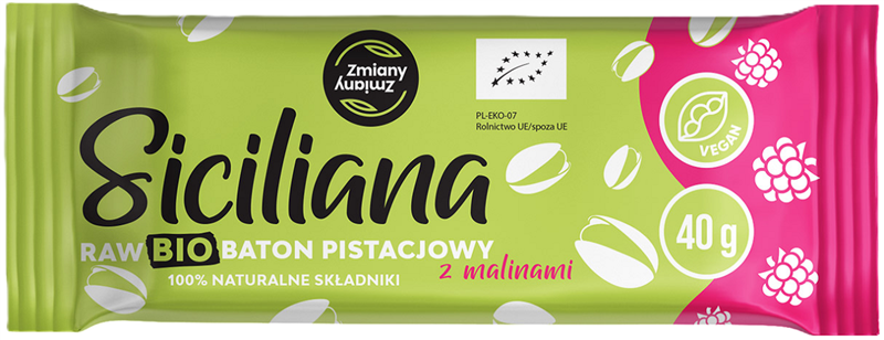 Baton Siciliana BIO pistacjowy z malinami 40g - delikatny smak południa w jednej przekąsce. Baton Siciliana to wyjątkowy baton bakaliowy łączący bogaty aromat pistacji z naturalną kwaskowatością malin. Idealna przekąska na każdą okazję – w podróży, pracy lub po treningu. W 100% roślinny, bezglutenowy, bez konserwantów, polepszaczy smaku, syropów, bez dodanego cukru. Zawiera naturalnie występujące cukry.